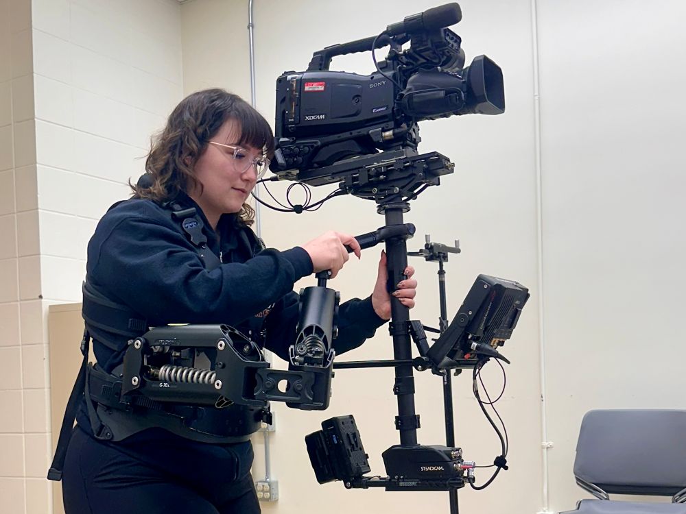 Marina learning how to operate a Steadicam during her time at SAIT. Photo by Jaymee Aitkenhead.