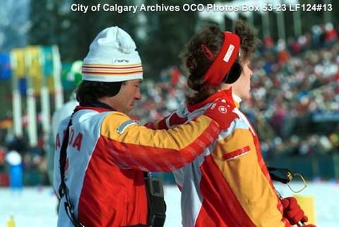 1988 – Unidentified Canadian athlete and coach before the women’s 4x5km relay.