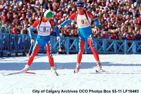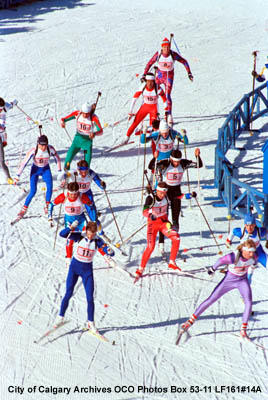 1988 – A group of competitors rounding a corner in the men’s 4 x 7.5km biathlon relay.