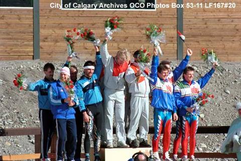1988 – Medal winners from the men’s 4 x 7.5km biathlon relay on the podium after accepting their medals. Gold medal: Union of Soviet Socialist Republics; Silver medal: Federal Republic of Germany; Bronze medal: Italy.